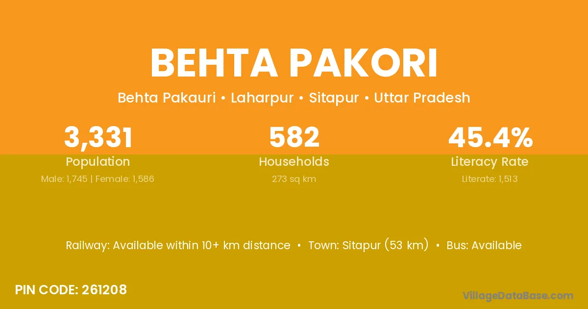 Sitapur (53 km) is the nearest town to Behta Pakori village for major economic activities and is located approximately 53 km away.
