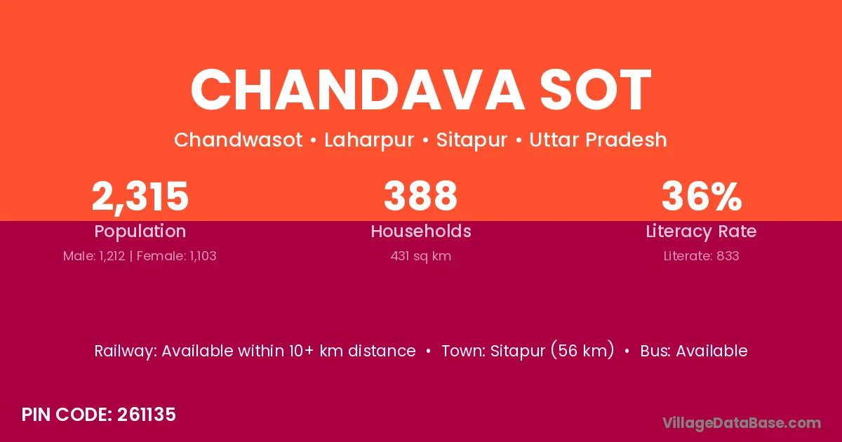 Sitapur (56 km) is the nearest town to Chandava Sot village for major economic activities and is located approximately 56 km away.