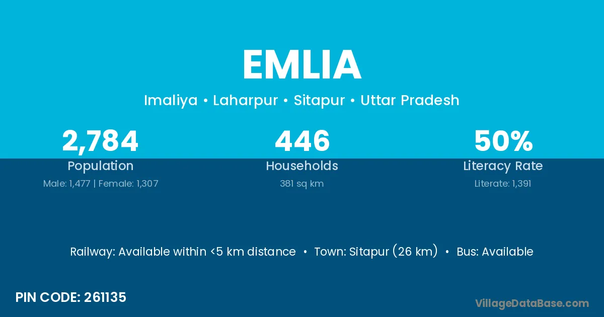 Sitapur (26 km) is the nearest town to Emlia village for major economic activities and is located approximately 26 km away.