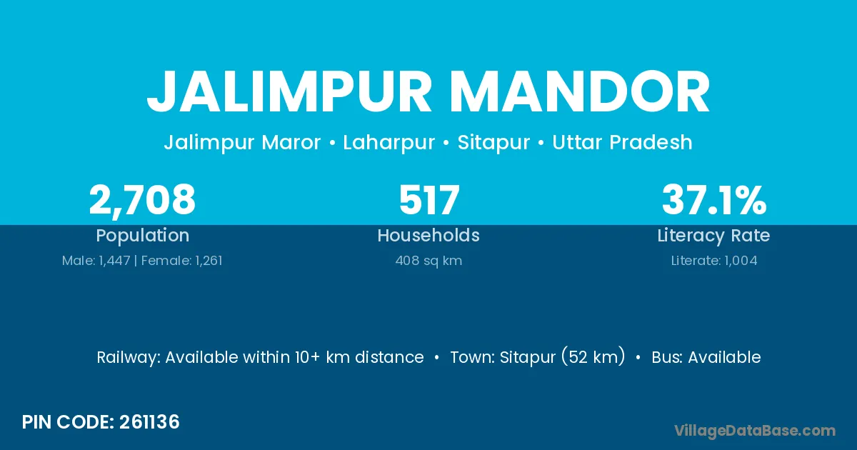 Sitapur (52 km) is the nearest town to Jalimpur Mandor village for major economic activities and is located approximately 52 km away.