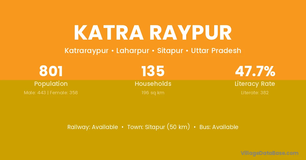 Sitapur (50 km) is the nearest town to Katra Raypur village for major economic activities and is located approximately 50 km away.