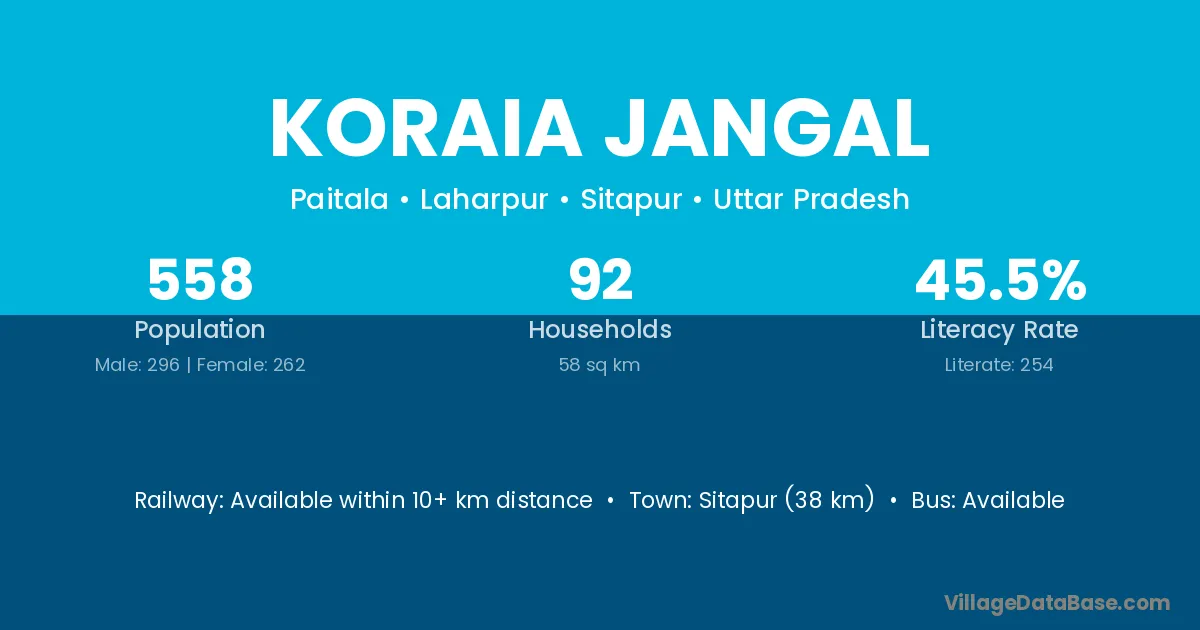 Sitapur (38 km) is the nearest town to Koraia Jangal village for major economic activities and is located approximately 38 km away.