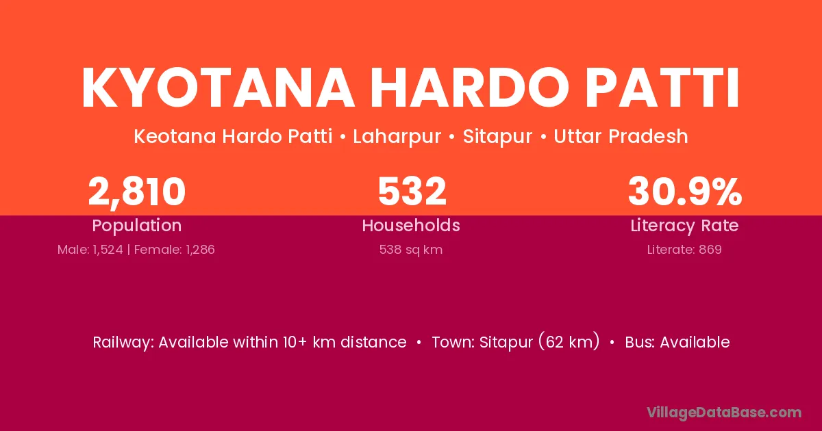 Sitapur (62 km) is the nearest town to Kyotana Hardo Patti village for major economic activities and is located approximately 62 km away.