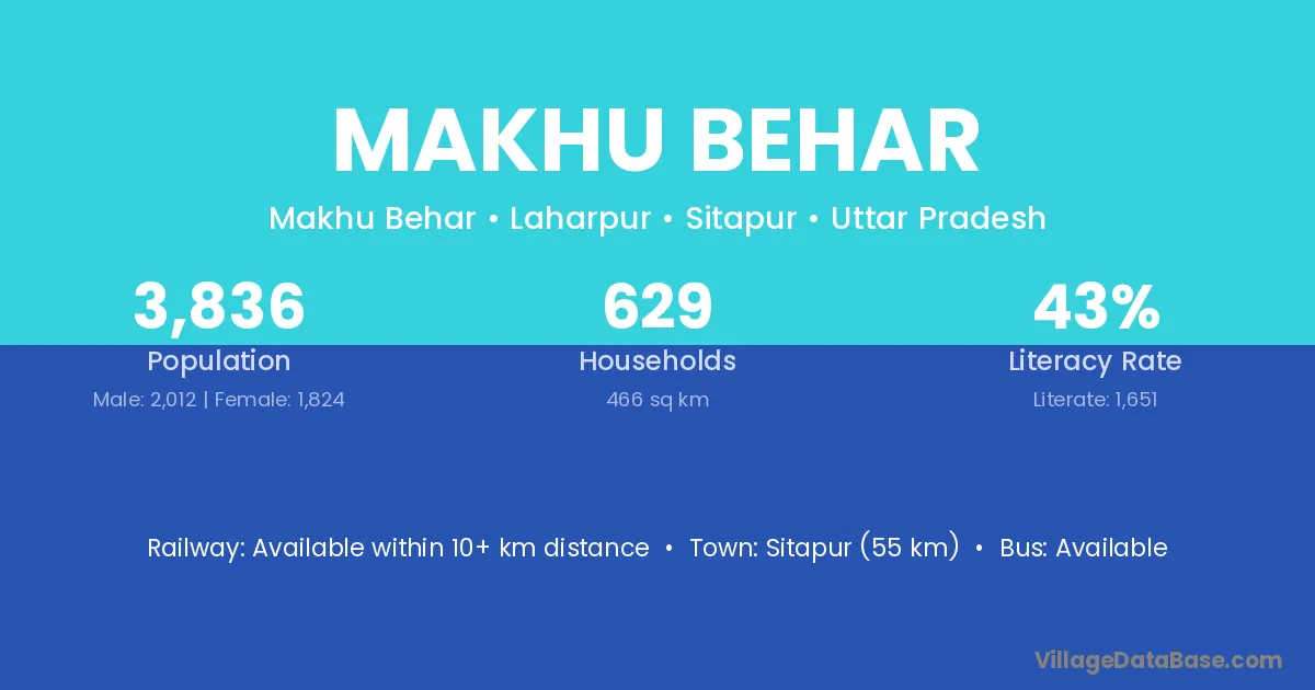 Sitapur (55 km) is the nearest town to Makhu Behar village for major economic activities and is located approximately 55 km away.