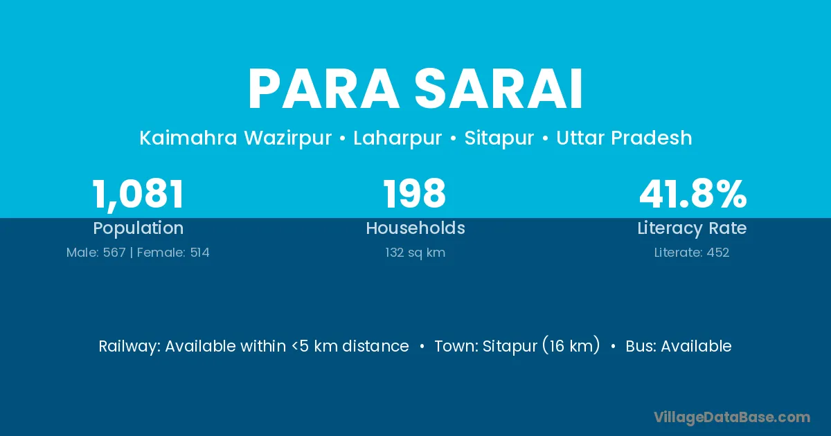 Sitapur (16 km) is the nearest town to Para Sarai village for major economic activities and is located approximately 16 km away.