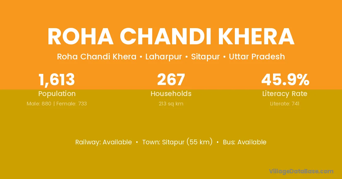 Sitapur (55 km) is the nearest town to Roha Chandi Khera village for major economic activities and is located approximately 55 km away.