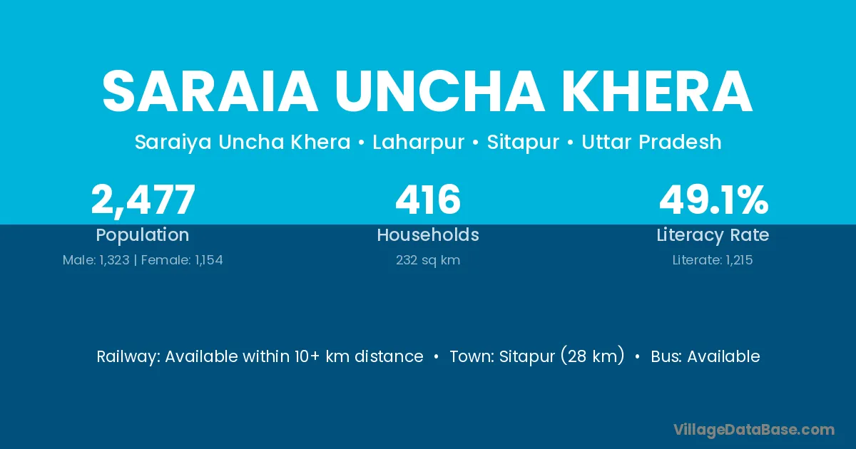 Sitapur (28 km) is the nearest town to Saraia Uncha Khera village for major economic activities and is located approximately 28 km away.