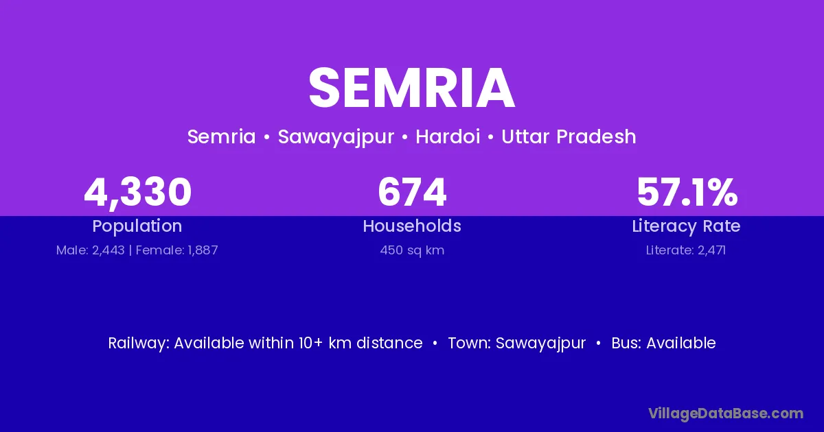 Sitapur (63 km) is the nearest town to Semria village for major economic activities and is located approximately 63 km away.