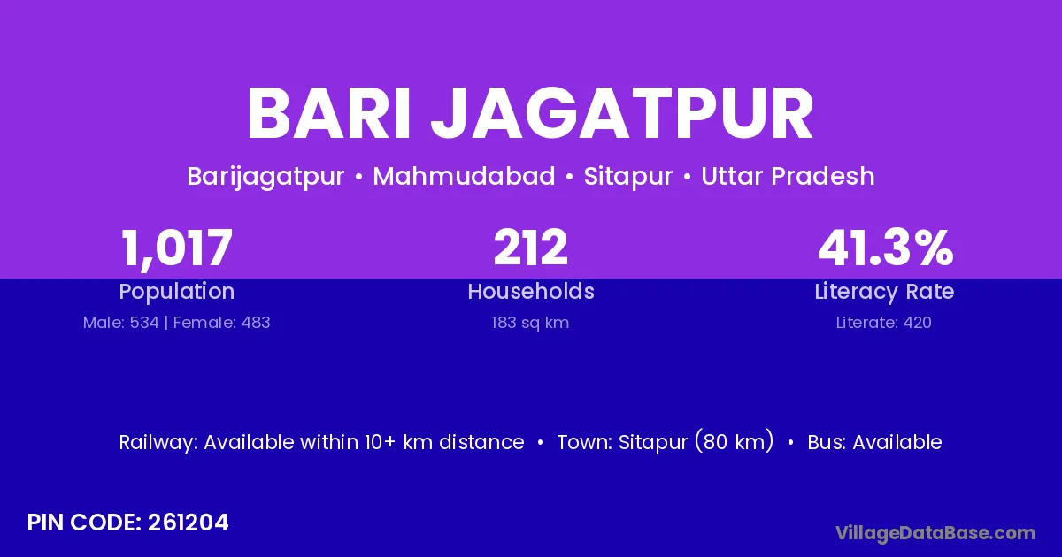 Sitapur (80 km) is the nearest town to Bari Jagatpur village for major economic activities and is located approximately 80 km away.