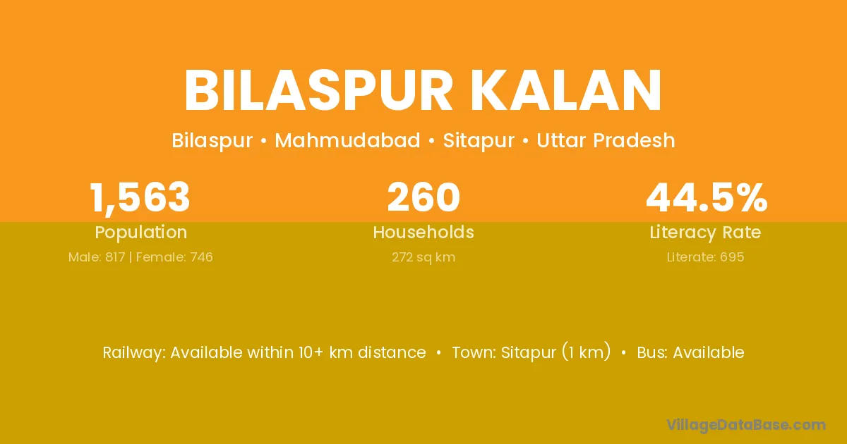 Sitapur (1 km) is the nearest town to Bilaspur Kalan village for major economic activities and is located approximately 1 km away.