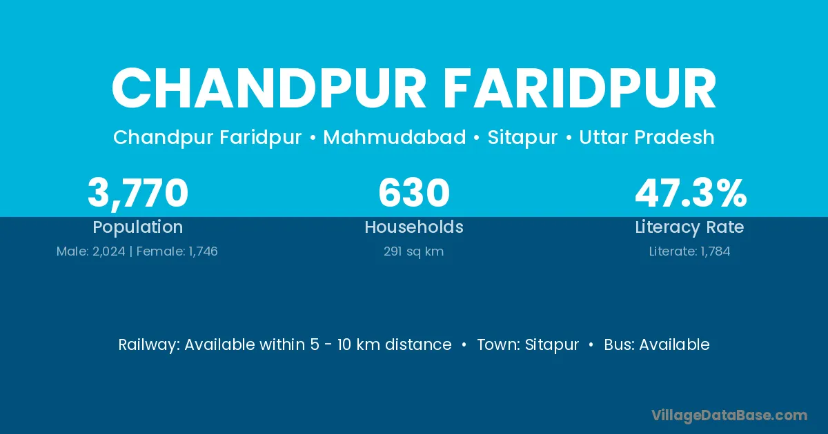 Chandpur Faridpur village has a total population of 3,770 people, of which 2,024 are males and 1,746 are females.