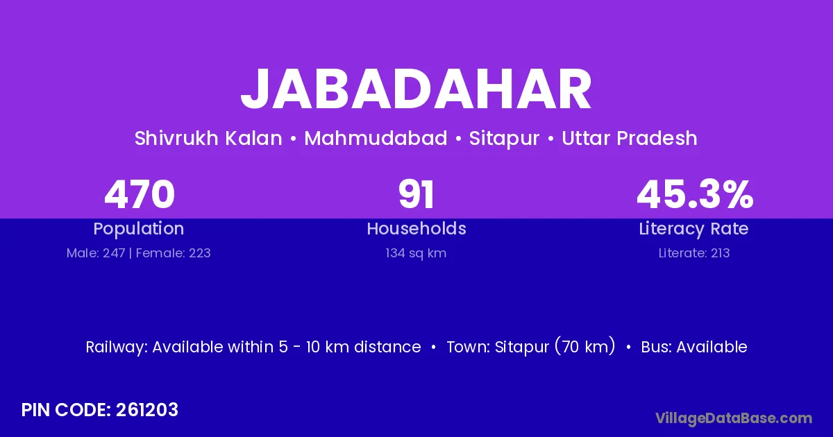 Sitapur (70 km) is the nearest town to Jabadahar village for major economic activities and is located approximately 70 km away.