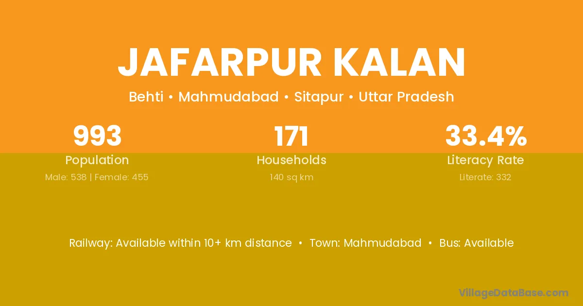 Jafarpur Kalan village has a total population of 993 people, of which 538 are males and 455 are females.
