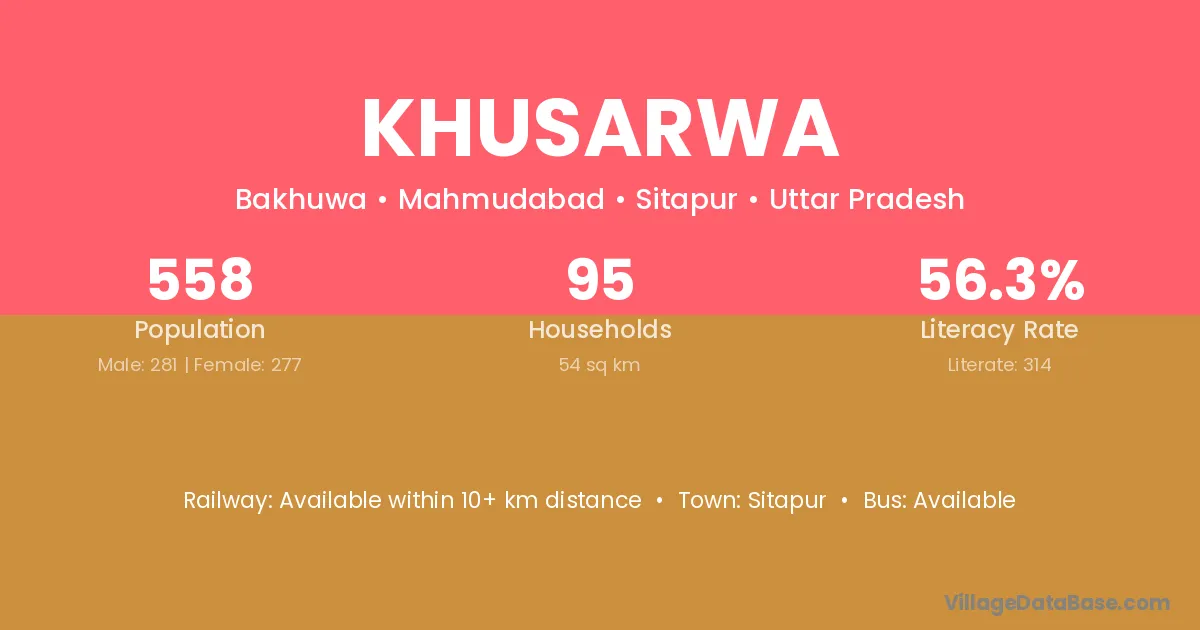 Khusarwa village has a total population of 558 people, of which 281 are males and 277 are females.