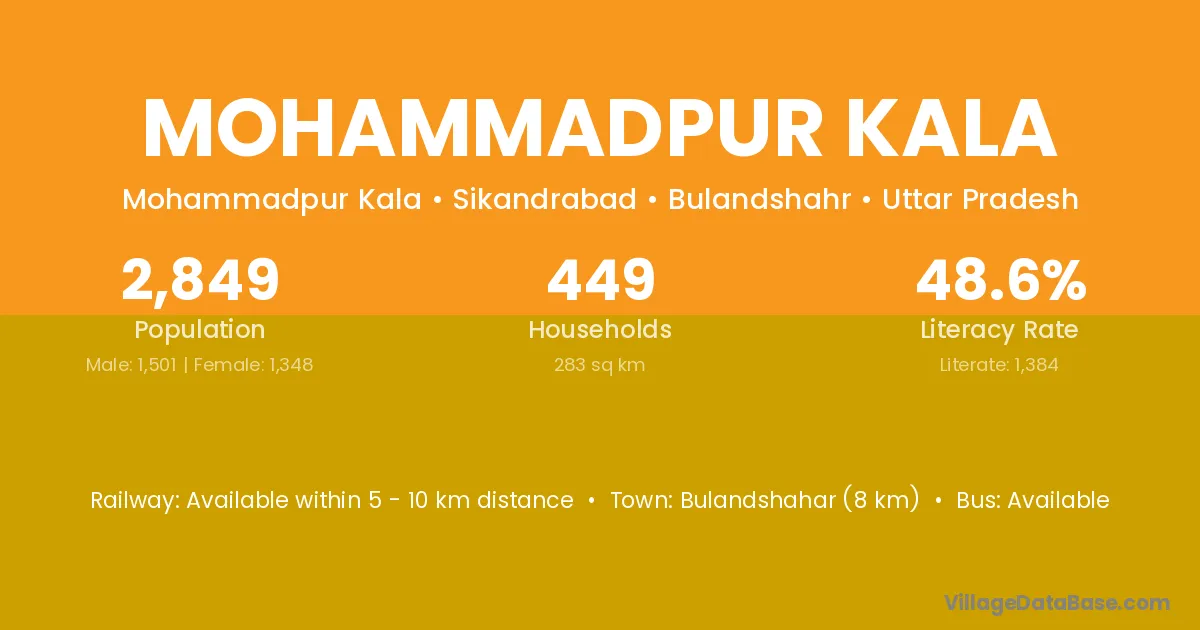 Sitapur (60 km) is the nearest town to Mohammadpur Kala village for major economic activities and is located approximately 60 km away.