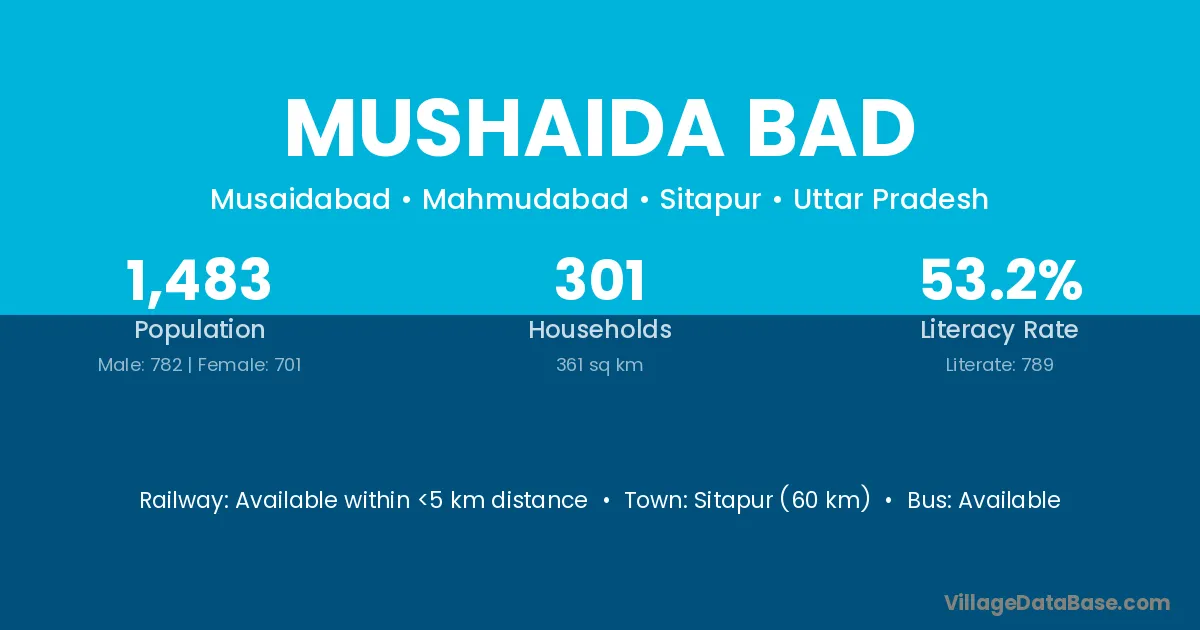 Mushaida Bad village has a total population of 1,483 people, of which 782 are males and 701 are females.