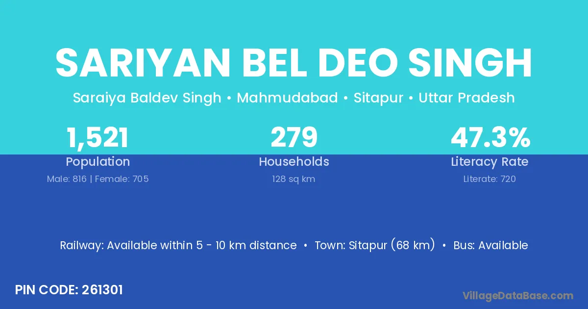 Sariyan Bel Deo Singh village has a total population of 1,521 people, of which 816 are males and 705 are females.