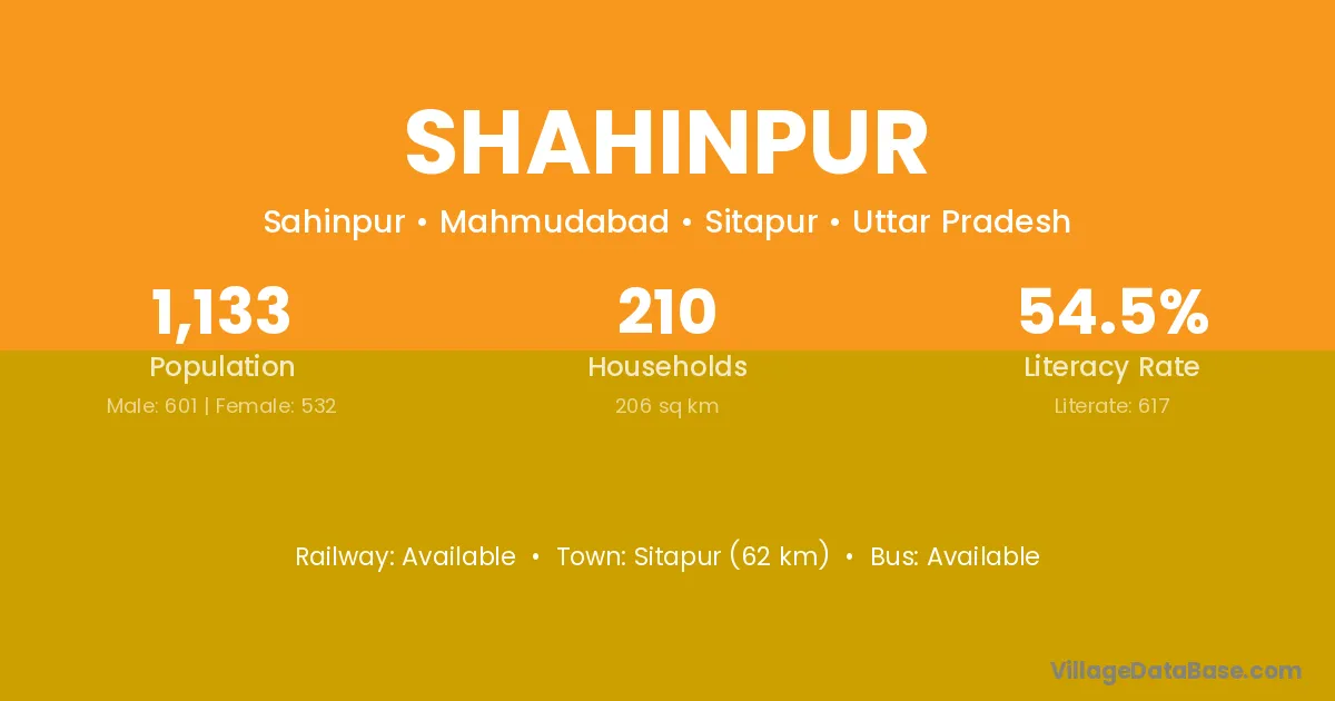 Sitapur (62 km) is the nearest town to Shahinpur village for major economic activities and is located approximately 62 km away.