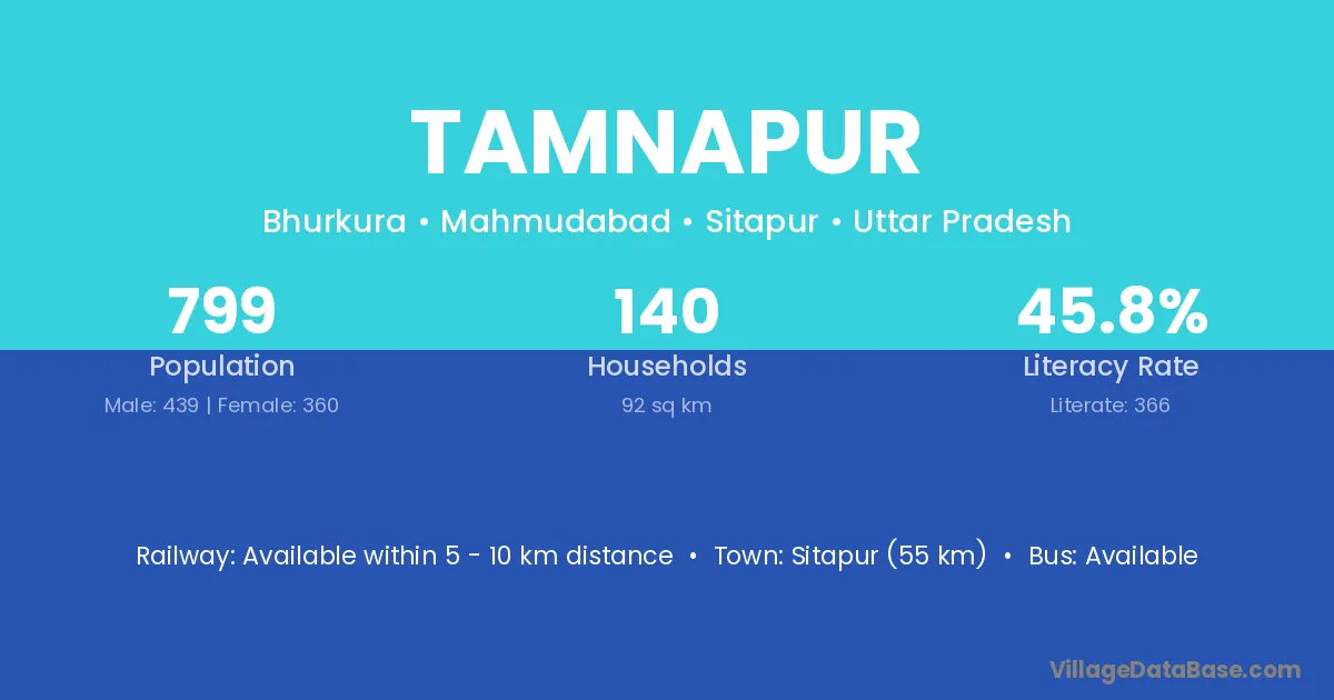 Sitapur (55 km) is the nearest town to Tamnapur village for major economic activities and is located approximately 55 km away.