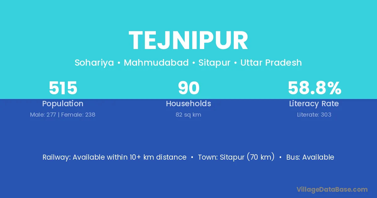 Sitapur (70 km) is the nearest town to Tejnipur village for major economic activities and is located approximately 70 km away.