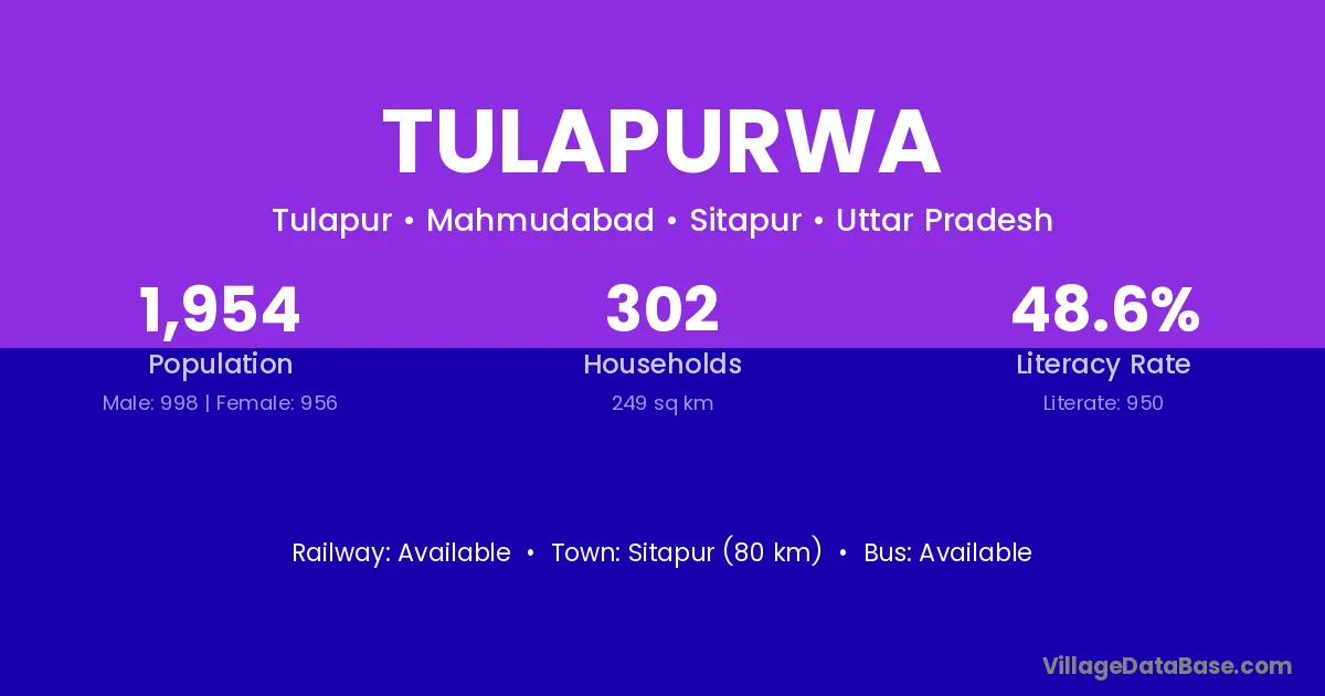 Sitapur (80 km) is the nearest town to Tulapurwa village for major economic activities and is located approximately 80 km away.