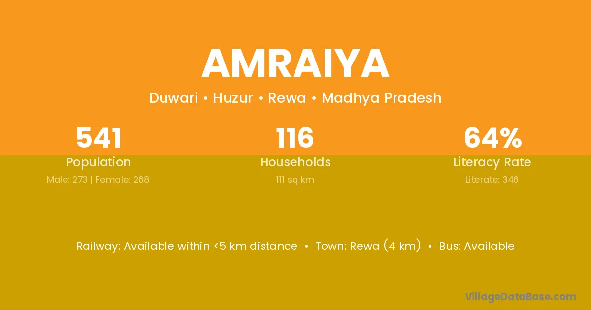 The literacy rate of Amraiya village is 54.48%. Male literacy stands at 68.28% and female literacy at 38.52%.