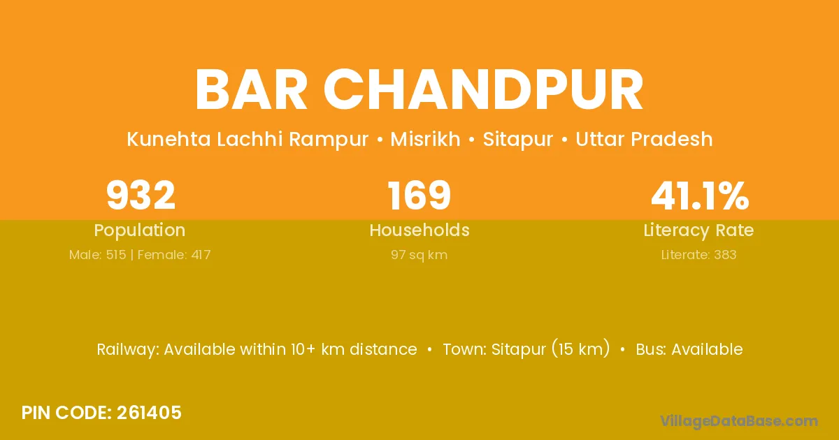 Sitapur (15 km) is the nearest town to Bar Chandpur village for major economic activities and is located approximately 15 km away.