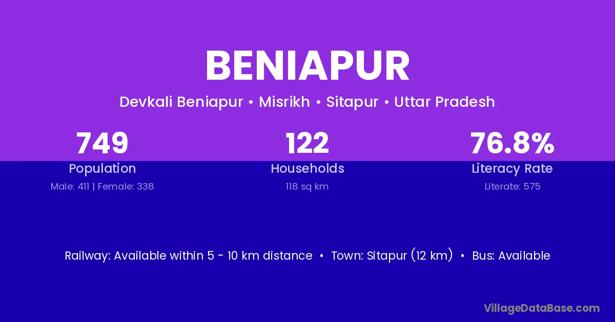 Sitapur (12 km) is the nearest town to Beniapur village for major economic activities and is located approximately 12 km away.