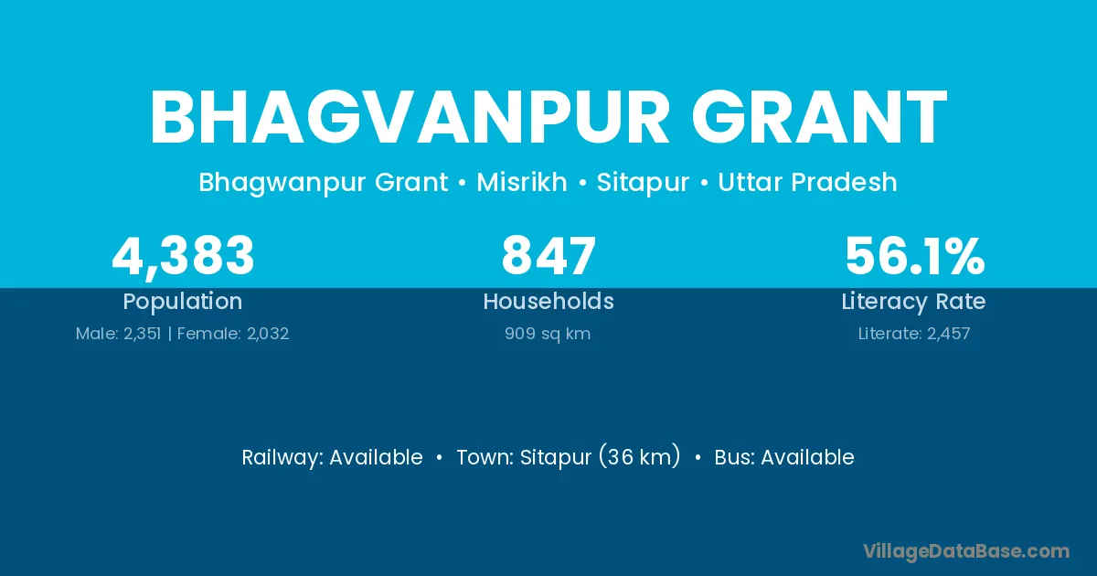 Sitapur (36 km) is the nearest town to Bhagvanpur Grant village for major economic activities and is located approximately 36 km away.