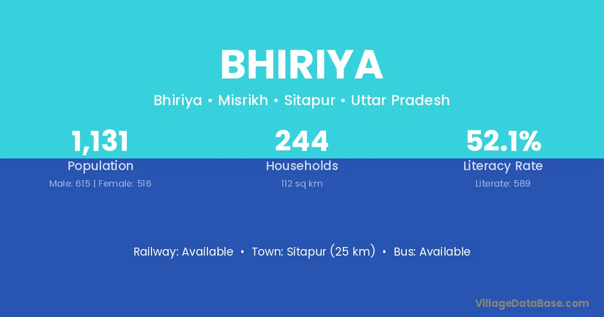 Sitapur (25 km) is the nearest town to Bhiriya village for major economic activities and is located approximately 25 km away.