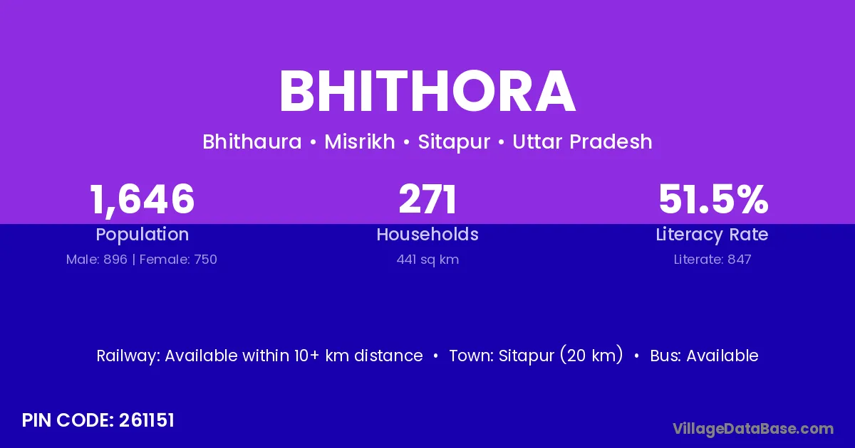 Sitapur (20 km) is the nearest town to Bhithora village for major economic activities and is located approximately 20 km away.
