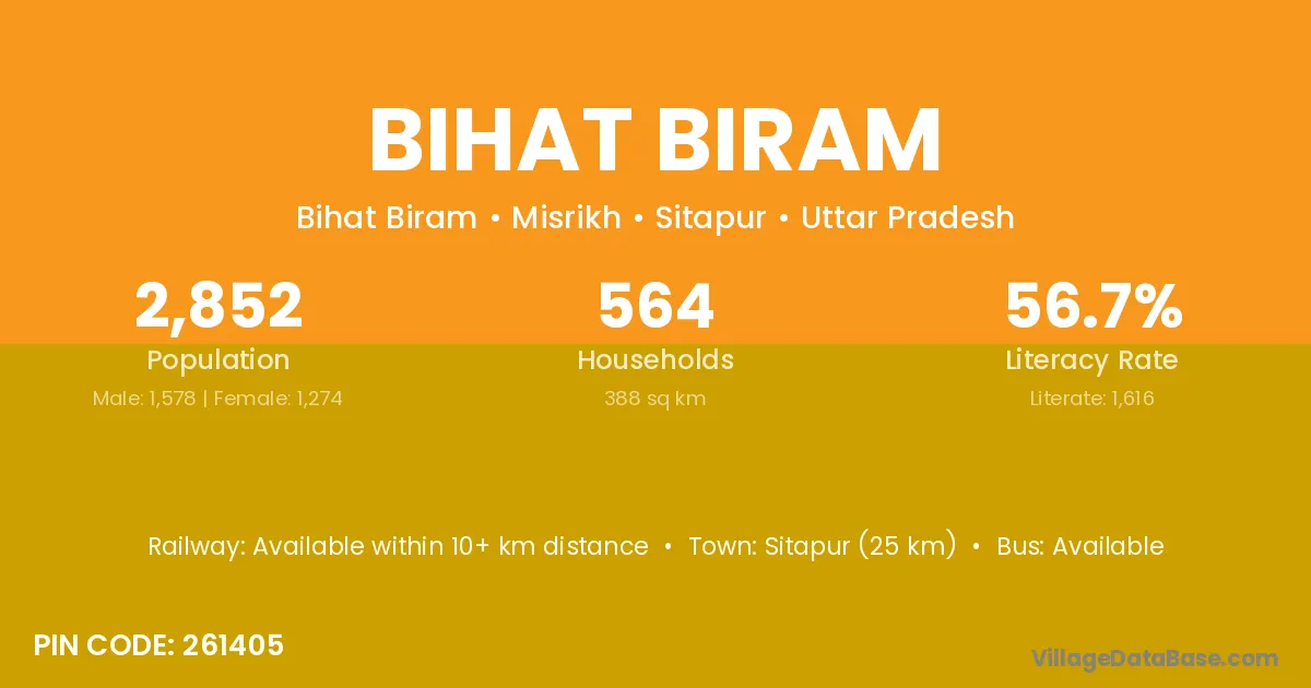 Sitapur (25 km) is the nearest town to Bihat Biram village for major economic activities and is located approximately 25 km away.