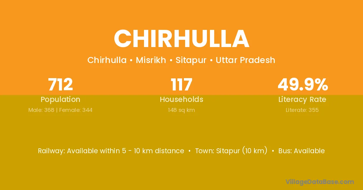 Sitapur (10 km) is the nearest town to Chirhulla village for major economic activities and is located approximately 10 km away.