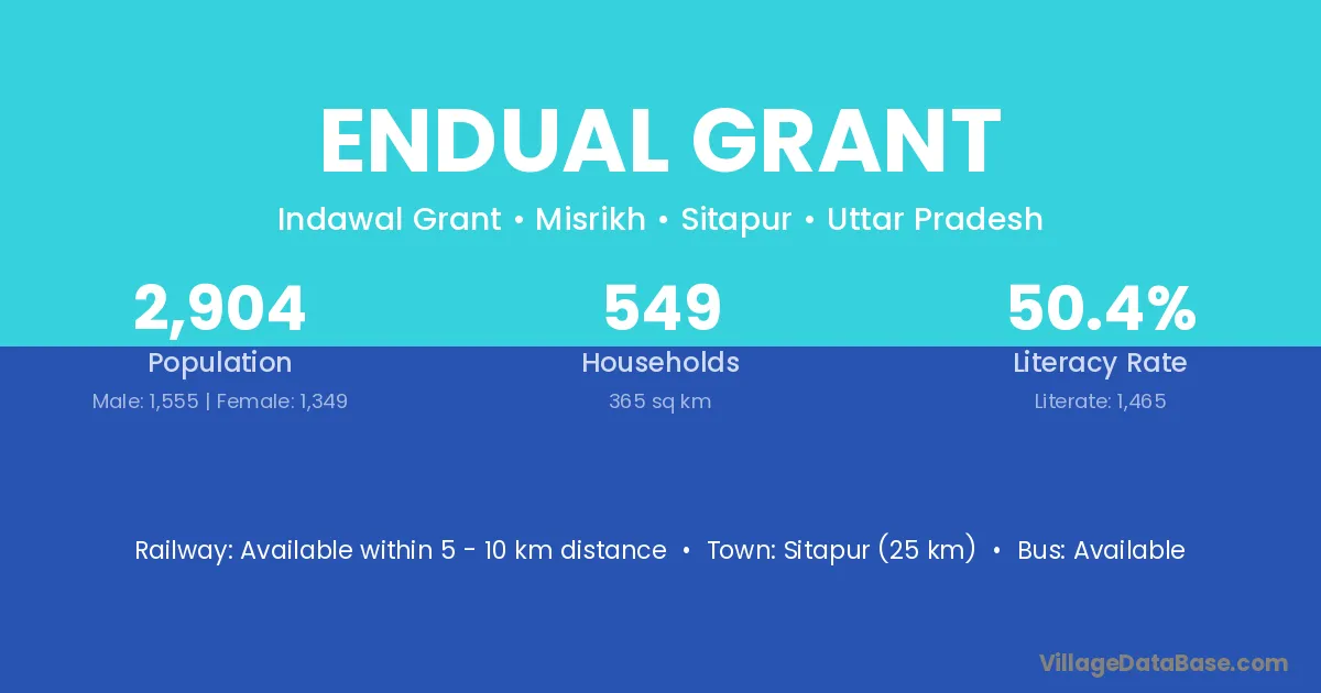 Sitapur (25 km) is the nearest town to Endual Grant village for major economic activities and is located approximately 25 km away.