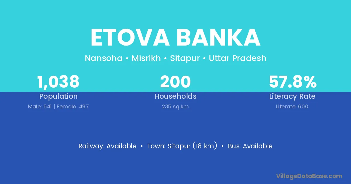 Sitapur (18 km) is the nearest town to Etova Banka village for major economic activities and is located approximately 18 km away.