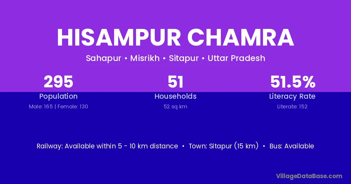 Sitapur (15 km) is the nearest town to Hisampur Chamra village for major economic activities and is located approximately 15 km away.
