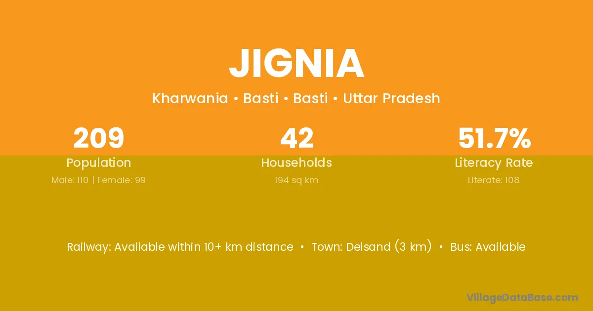 The literacy rate of Jignia village is 66.94%. Male literacy stands at 77.31% and female literacy at 54.91%.