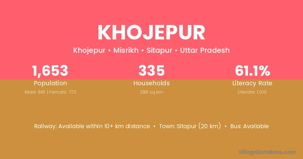 Sitapur (20 km) is the nearest town to Khojepur village for major economic activities and is located approximately 20 km away.