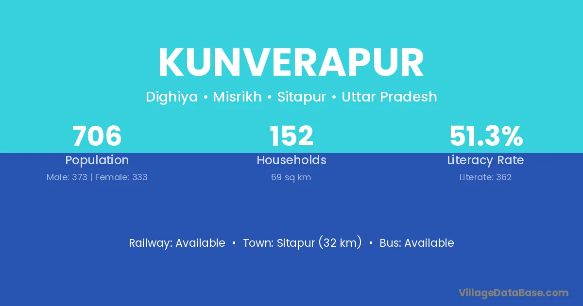 Sitapur (32 km) is the nearest town to Kunverapur village for major economic activities and is located approximately 32 km away.
