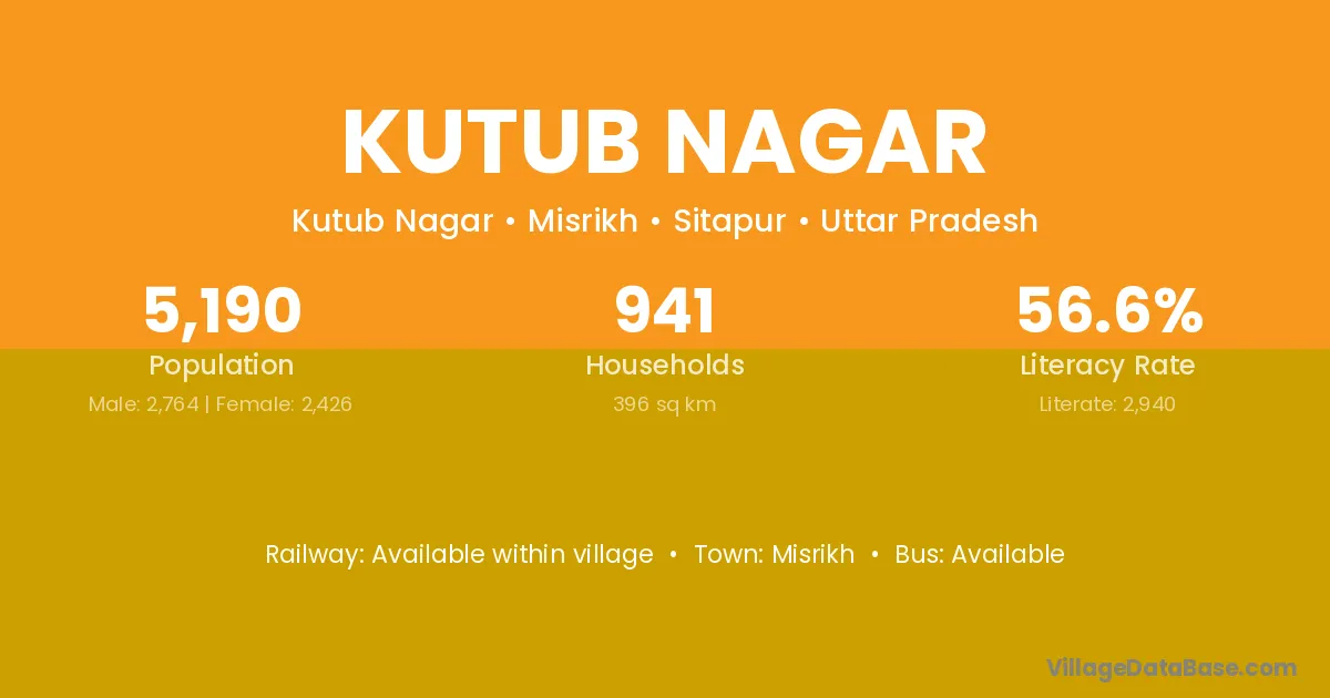 Kutub Nagar village has a total population of 5,190 people, of which 2,764 are males and 2,426 are females.
