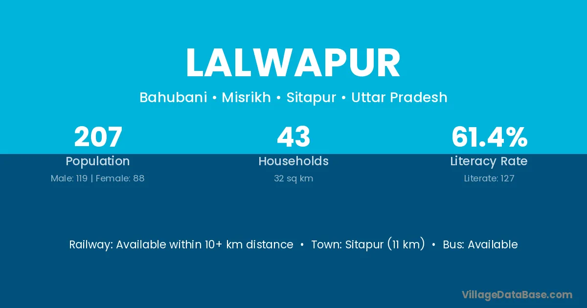 Sitapur (11 km) is the nearest town to Lalwapur village for major economic activities and is located approximately 11 km away.