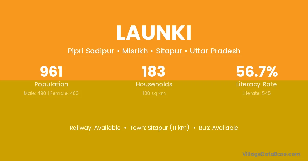 Sitapur (11 km) is the nearest town to Launki village for major economic activities and is located approximately 11 km away.