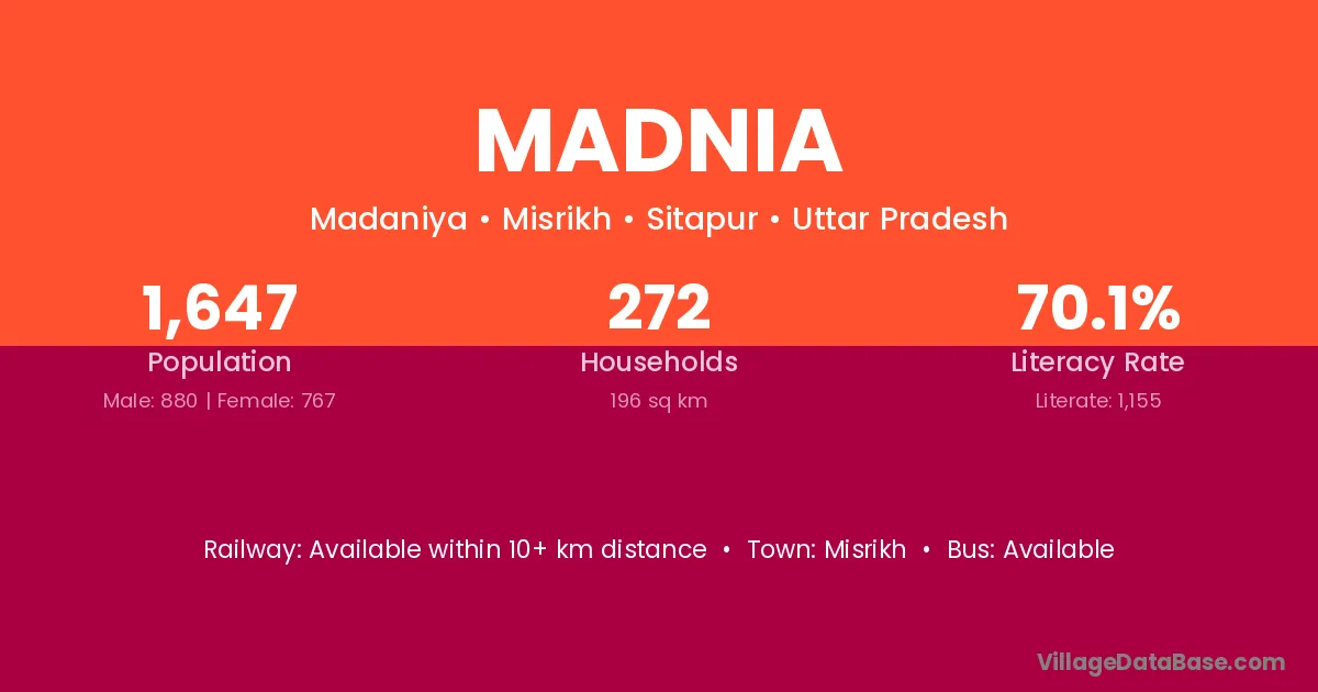 Madnia village has a total population of 1,647 people, of which 880 are males and 767 are females.