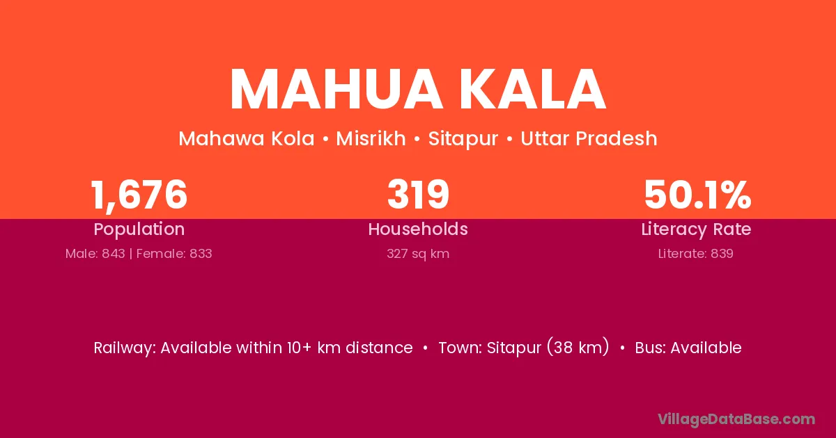 Mahua Kala village has a total population of 1,676 people, of which 843 are males and 833 are females.