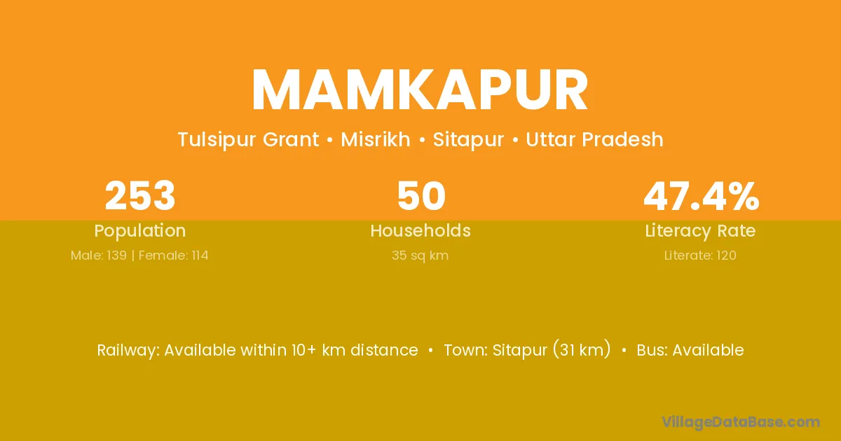 Sitapur (31 km) is the nearest town to Mamkapur village for major economic activities and is located approximately 31 km away.