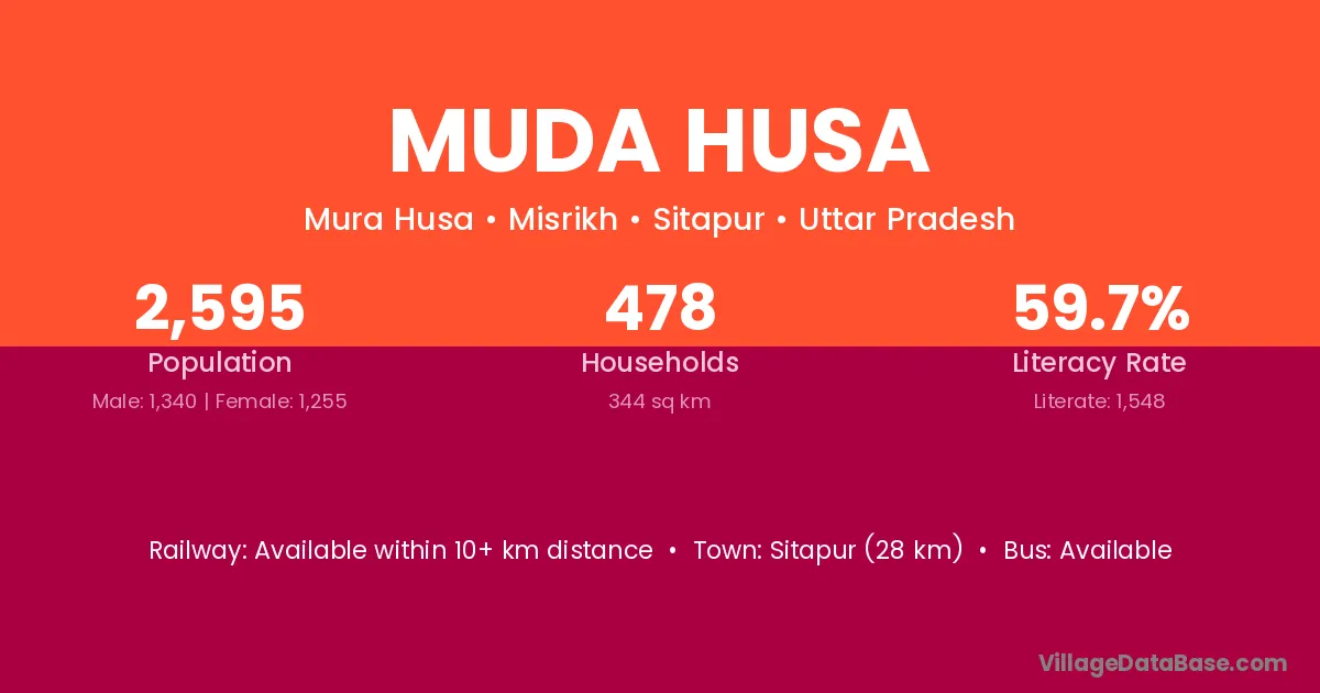 Sitapur (28 km) is the nearest town to Muda Husa village for major economic activities and is located approximately 28 km away.
