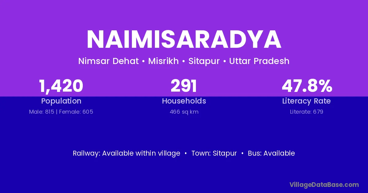 Naimisaradya village has a total population of 1,420 people, of which 815 are males and 605 are females.