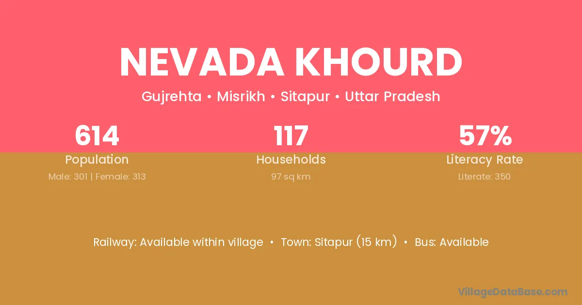 Sitapur (15 km) is the nearest town to Nevada Khourd village for major economic activities and is located approximately 15 km away.