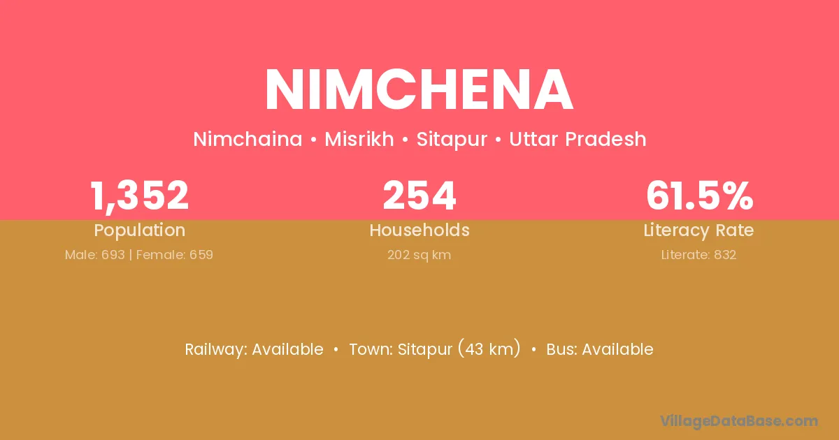 Sitapur (43 km) is the nearest town to Nimchena village for major economic activities and is located approximately 43 km away.