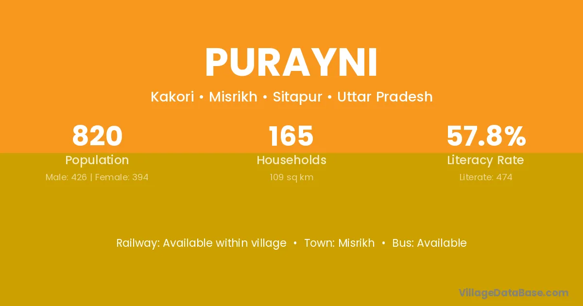 Purayni village has a total population of 820 people, of which 426 are males and 394 are females.